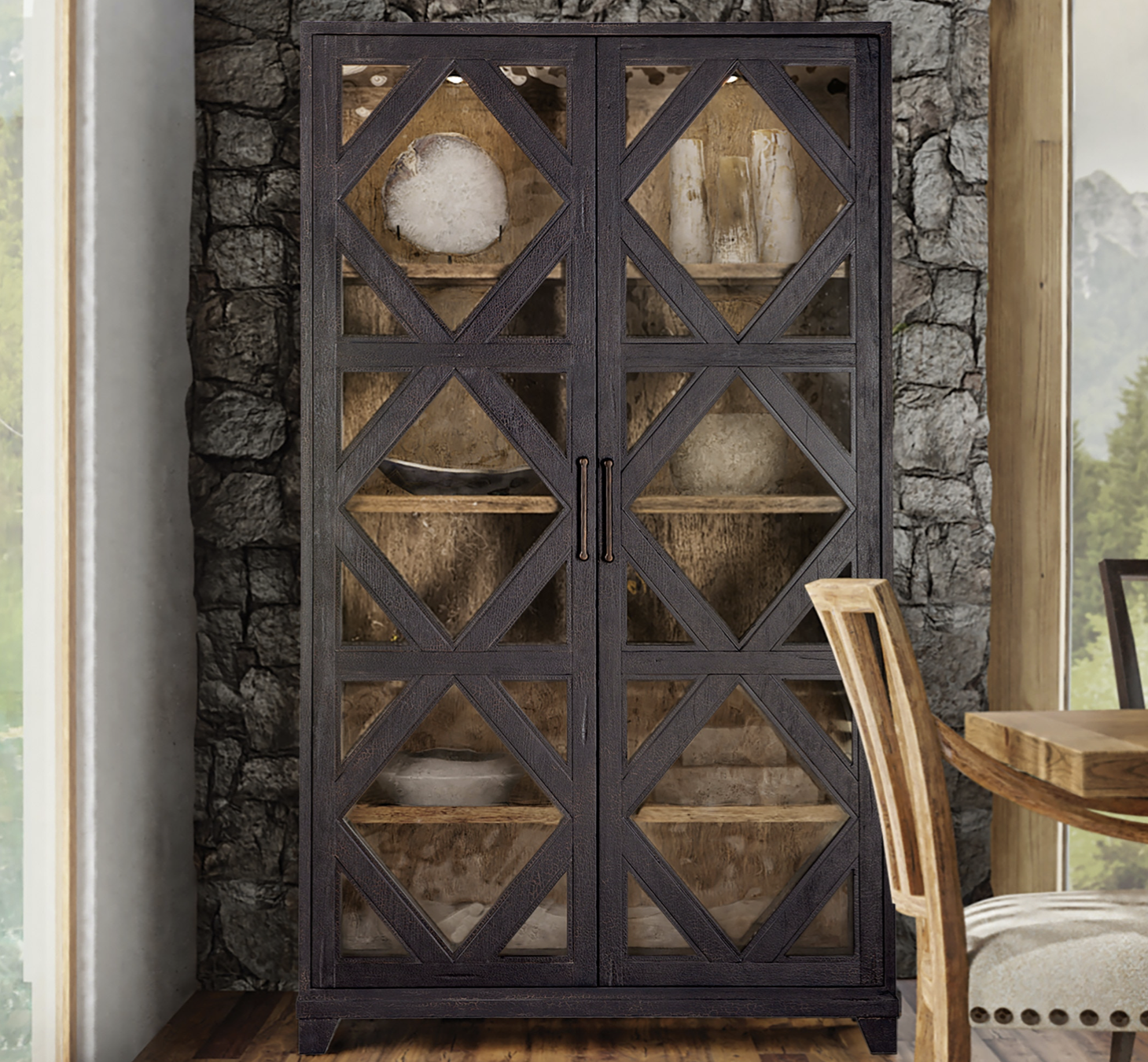 Finish: Vintage Natural: a warm, rustic, organic finish over hickory veneers. Distressing includes chopping, rock, drawknife, gauging, chain distressing and wire brush.