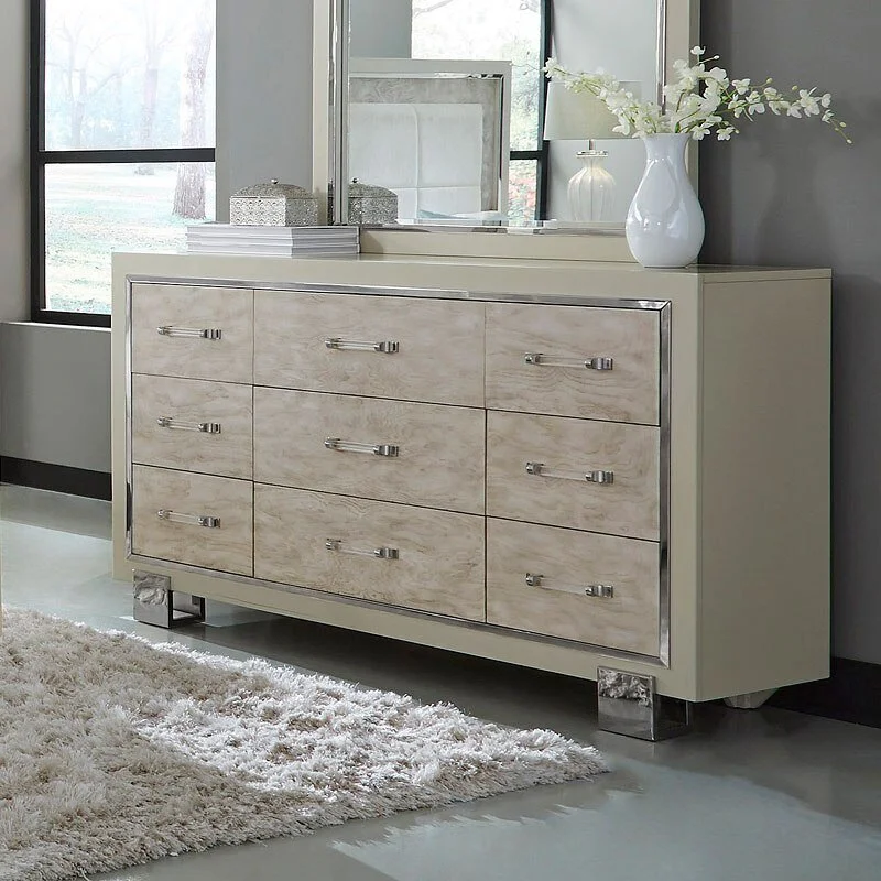 Polished and sophisticated, the Cydney collection captures the essence of contemporary styling. Cream colored cases are counterpointed with chrome finished trim and feet, dramatic swirley white ash veneers, and a high gloss finish. The headboard features a cream upholstered panel.