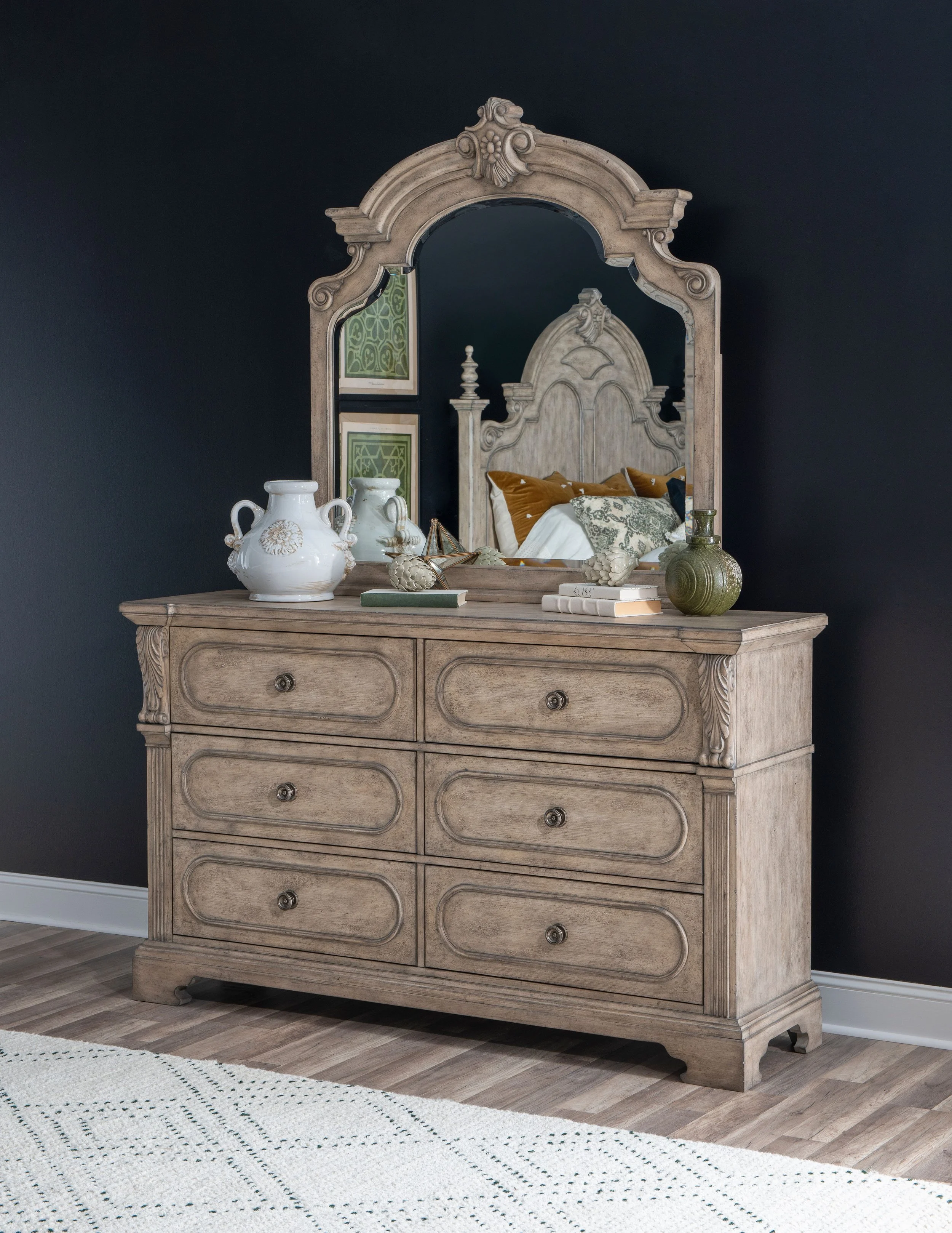 Inspired by rustic villas of Italy, the Sorona collection combines Old World design influences with fashionable forms and finishes. Traditional European furniture elements meld with the relaxed time-worn finish that brings a sense of calm and luxury to any interior.Design details such as fluted pilasters, framed drawer fronts, acanthus and fleur-de-lis carvings give each piece an authentic and timeless appeal. The scale of Sorona creates a bold statement, while the heavily distressed and aged Biscotti finish on Oak veneers creates an inviting palette. Inset stone tops on items and Aged Pewter finished hardware add the final touches to this bedroom and dining collection.