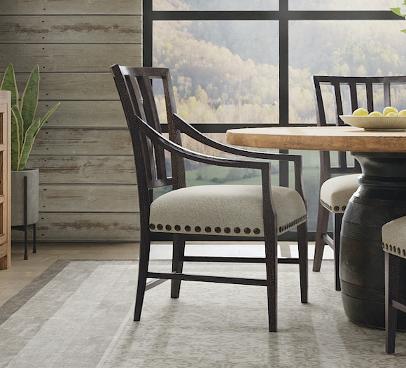 Inspired by the natural beauty of the American wilderness landscapes, the Big Sky Side Chair is tactile, rustic and relaxing. Featuring a contrasting warm brown leather seat, a fabric back in Evere Cream and a crosshatch design on the back in the charcoal Furrowed Bark, the chair has wood legs and a stretcher finished in Vintage Natural, a warm color over Hickory Veneers. The natural beauty and near mystical experience of the American wilderness inspires a spirited collection from Hooker Furniture, a celebration of dramatic vistas and the freedom to roam, a land of rough-hewn timber and towering snow-capped peaks, boundless plains, and cool, clear mountain lakes. Hooker brings home a dream of wide-open spaces and a life lived in tandem with iconic landscapes with furnishings that evoke the weight, heft and heritage of post and beam construction, the mark and artistry of true craftspeople, and substantive, thoughtful designs right for today. Watch for warm, rustic, hickory veneer, and rich finishes like charred timber, dusk, and avalanche, organic textures like burlap and top grain leather, forged hardware, and classic moldings for the traditionalist. Those with a more modern bent will gravitate toward the clean lines of waterfall edges, crosshatch surfaces and planking details that speak to authenticity and the hand of the maker. Welcome to the peaceful, easy feeling of Big Sky. It’s time to simply breathe.